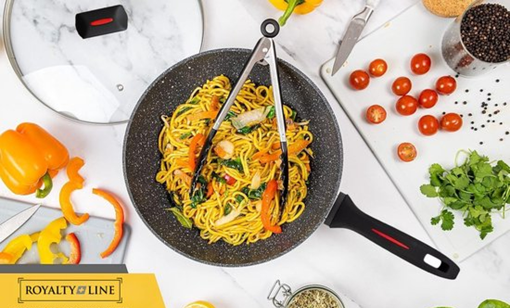 Royalty Line Nonstick wok pan uses stone-derived ceramic Titanium coating, which is free of APEO or PFOA! With the smooth interior and flat bottom, this frying pan can be used on all types of stoves and is ideal for preparing popular Asian specialties, frying eggs, steak, fillet, etc.