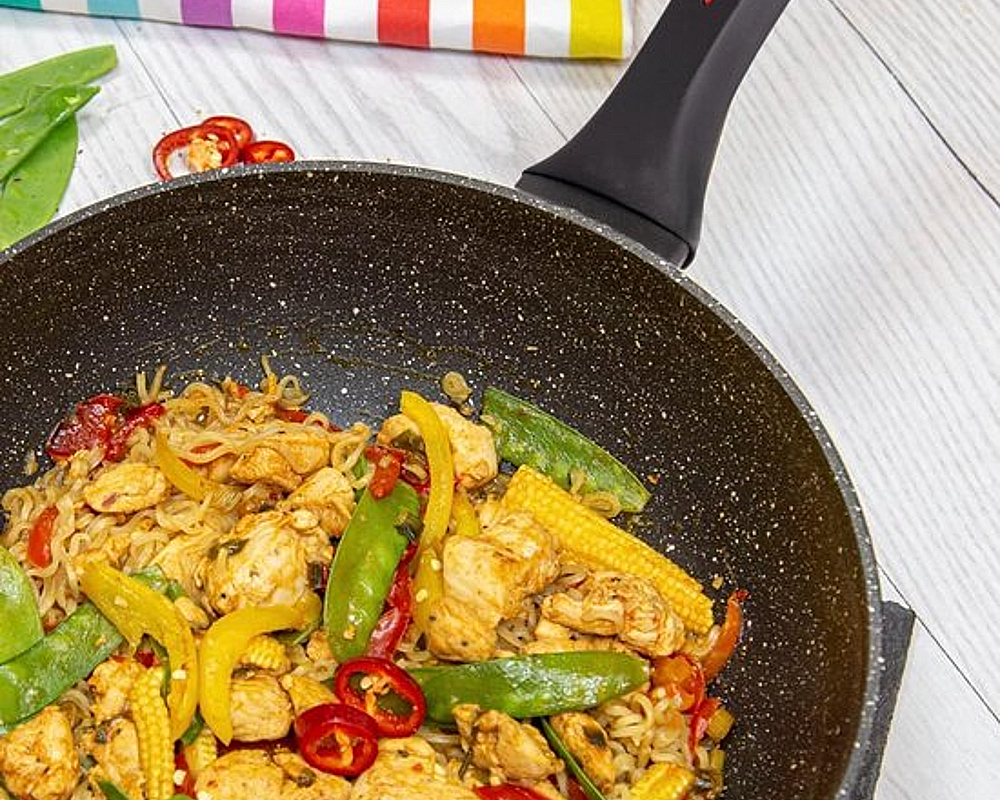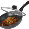 The wok comes with a glass lid, so it can also be used for steaming vegetables or seafood.